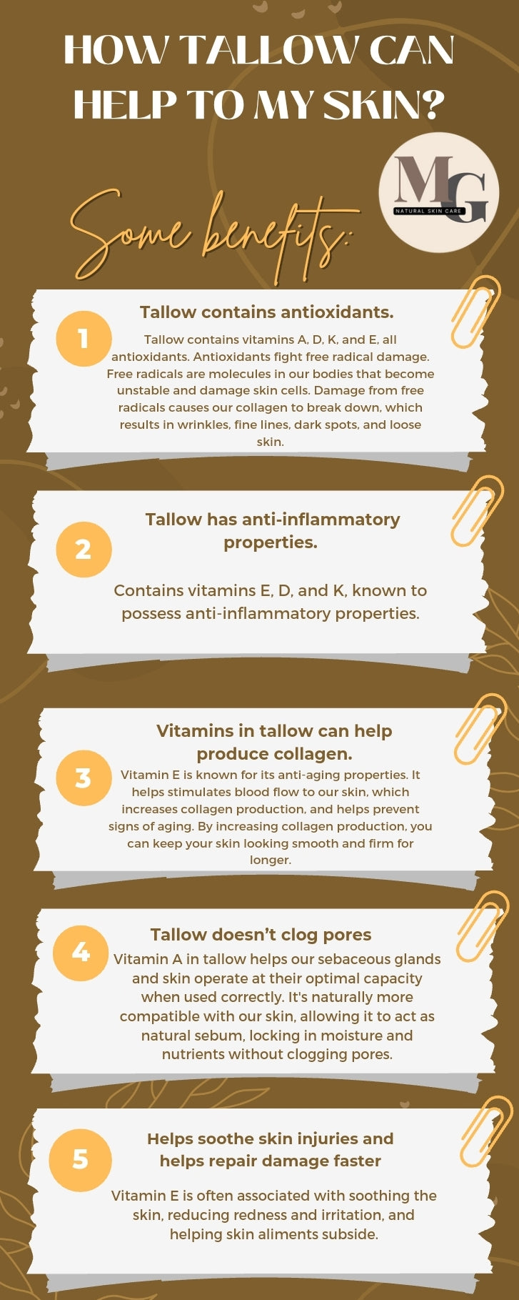 Tallow: has been used in skincare for centuries because of its incredible ability to moisturize, soothe, heal, and nourish all skin types. Contains vitamins A, D, K, and E, all antioxidants, has anti-inflammatory properties and can help produce collagen. Tallow helps soothe skin injuries and helps repair damage faster.